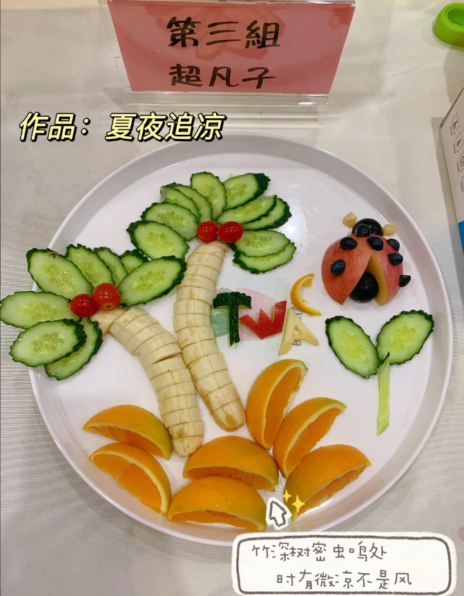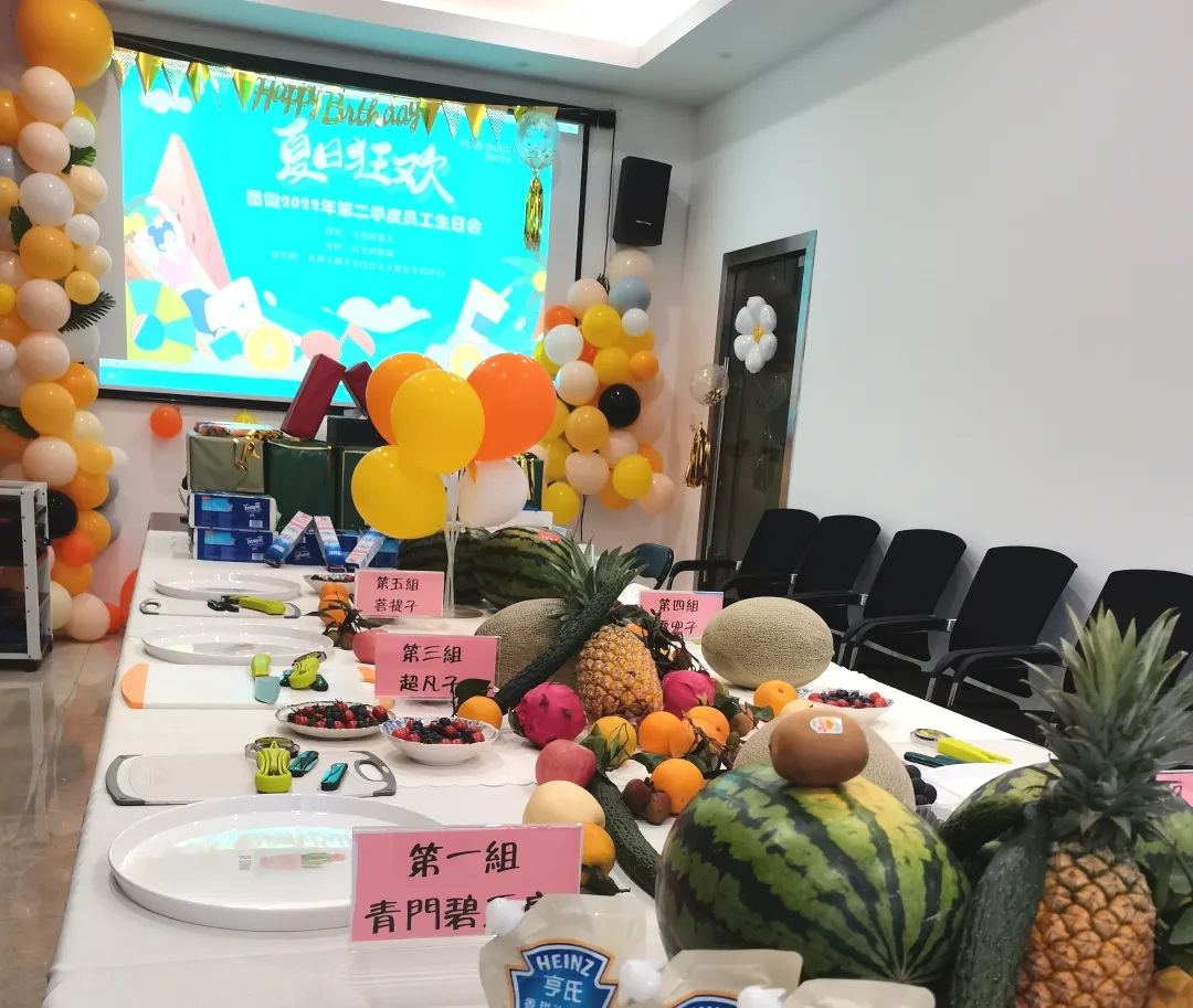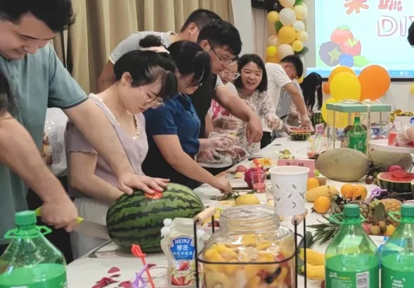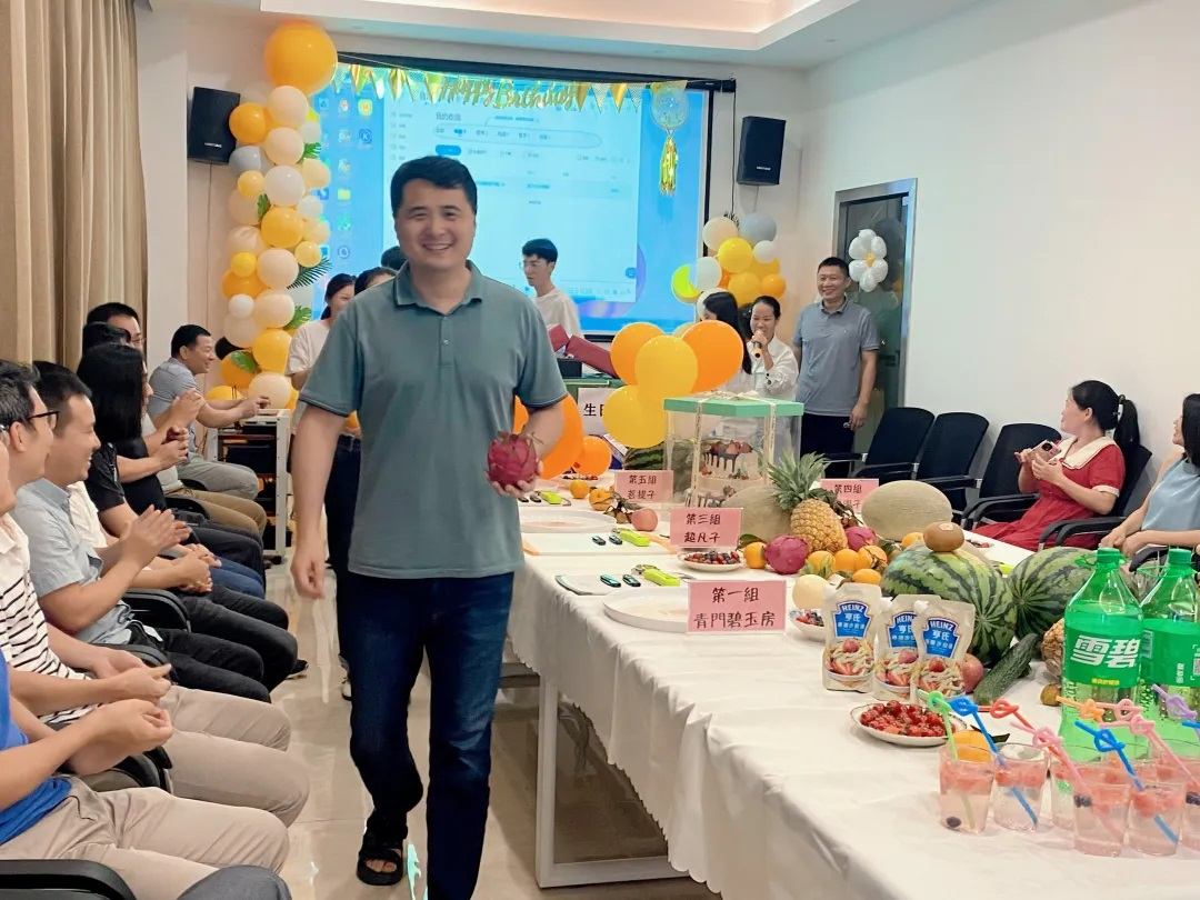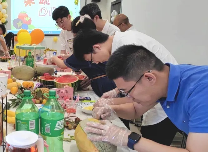 为了顺应夏至时节,活动进入到"果蔬DIY大比拼"环节,全体28名员工分为5对,在规定的时间内制作出一份色香味美的果盘。
