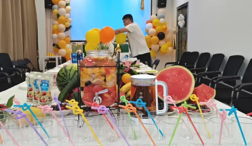 生日会接近尾声,香甜的生日蛋糕,丰富的水果点心,寿星们欢聚一堂,言语中透露着家人般的温暖和关怀。