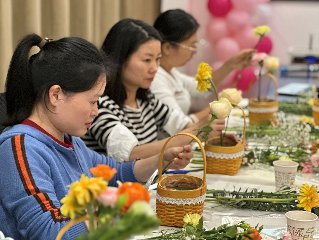 接下来,大家积极踊跃地参与到插花实践中来,发挥自己的想象与创意,亲手制作出了一件件充满个性的精美的花艺作品。在忙碌的工作中得到一份放松,在陶冶情操、调节身心的同时也感受到了花艺手作的乐趣与成就感,展现出女性的艺术魅力和风采。